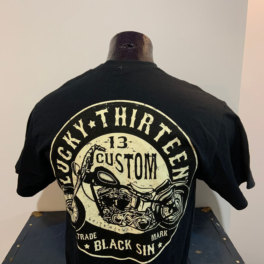 - Back Print: Features a striking motorcycle graphic with "Lucky Thirteen," "13 Custom," and "Black Sin" text in a vintage-inspired design. The circular layout adds a classic touch, making it a perfect piece for motorcycle enthusiasts.